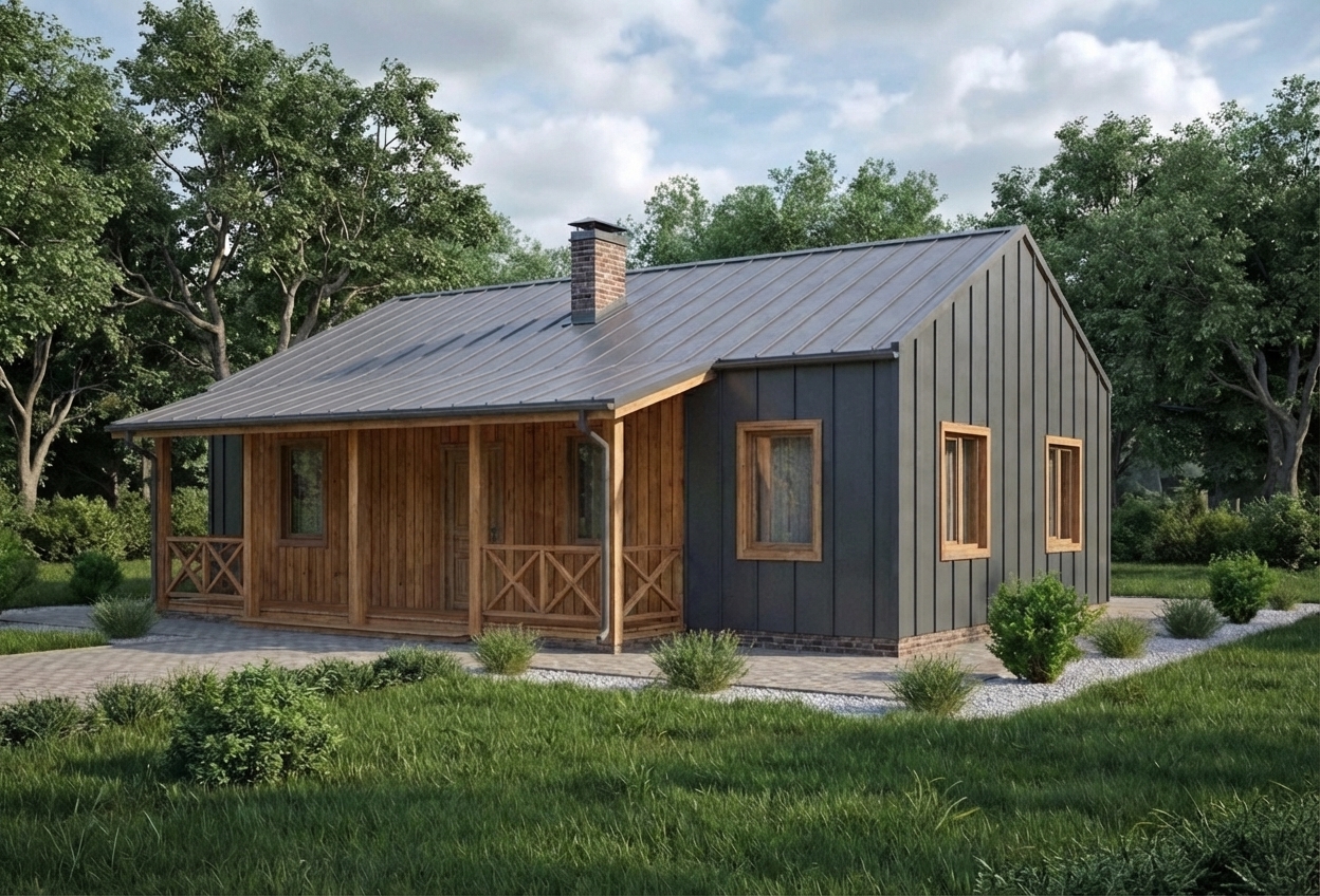 Современный одноэтажный дом в стиле барнхаус с 3 спальнями, котельной, кухней-гостиной и террасой.