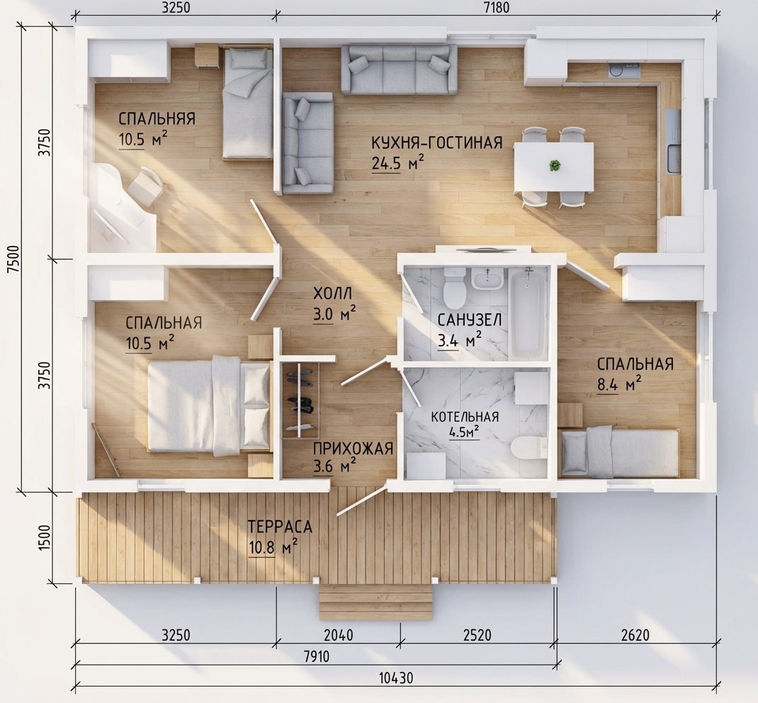 Стильный загородный дом с комбинированной отделкой фасада в популярном стиле барнхаус. Включает три изолированные спальни (две по 10.5 м² и одну 8.4 м²), светлую кухню-гостиную (24.5 м²), совмещенный санузел (3.4 м²), отдельную котельную (4.5 м²), удобную прихожую и крытую террасу (10.8 м²) вдоль фасада. Габариты дома: 10 х 9 м. Двускатная крыша без свесов.