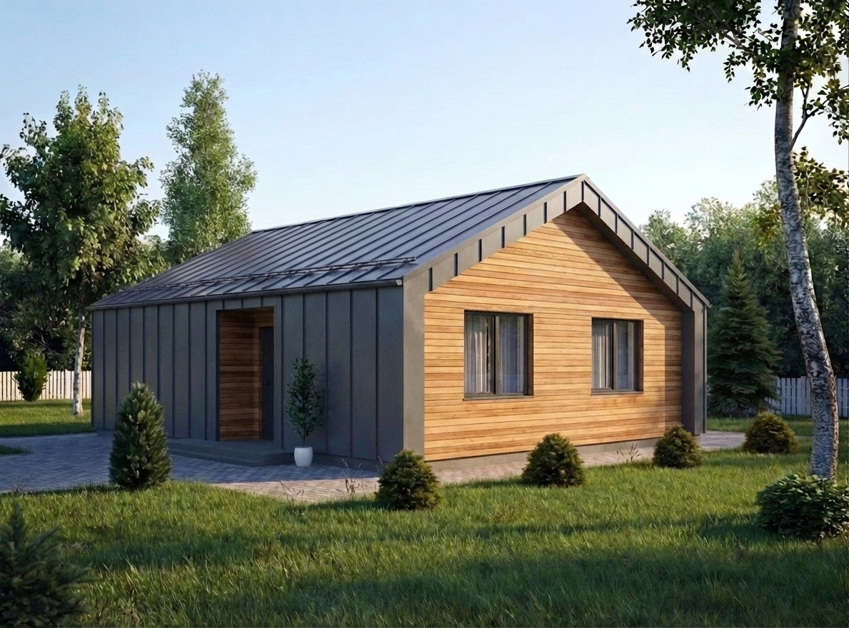 Удобный загородный дом с отделкой фасада металлом в популярном стиле барнхаус. Планировка включает две одинаковые просторные спальни (по 13.6 м²), объединенную зону кухни и гостиной (22.4 м²), совмещенный санузел (4.6 м²), холл и удобную прихожую с нишей под шкаф. На входе предусмотрено крыльцо под общей крышей. Габариты дома: 9 х 8 м. Двускатная крыша без свесов.
