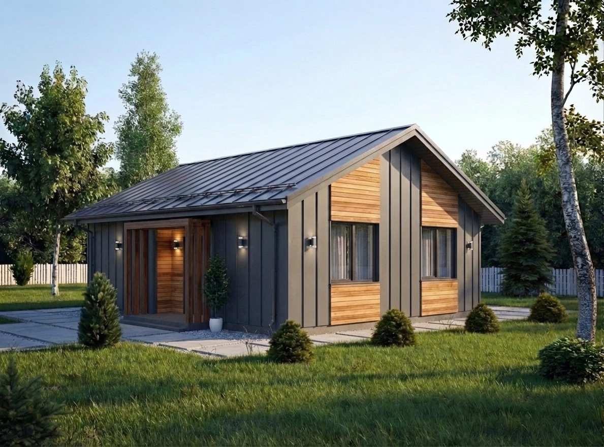 Практичный одноэтажный дом в классическом стиле с 2 спальнями и просторной кухней-гостиной.