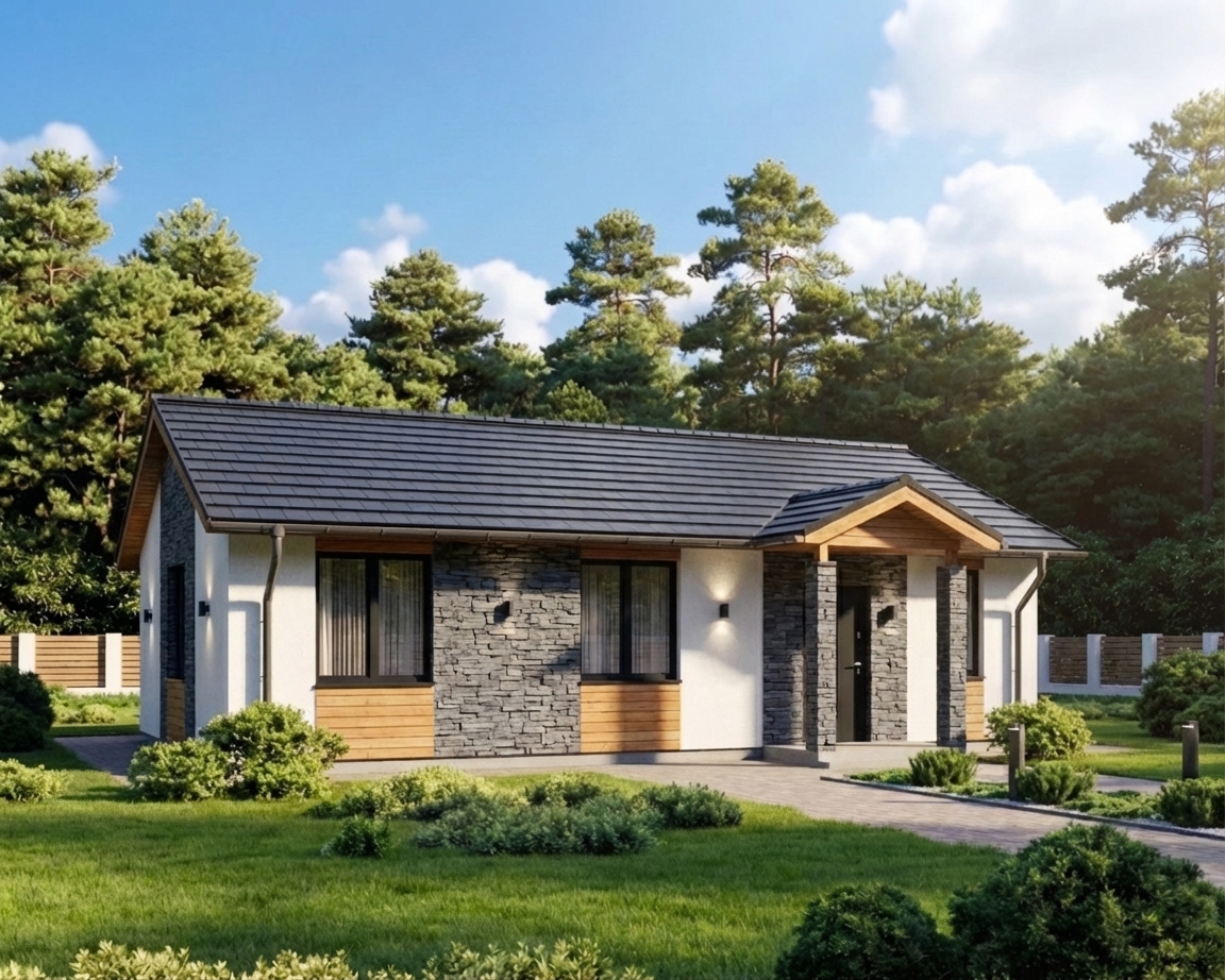 Вместительный одноэтажный дом в польском стиле с 3 спальнями, котельной и кухней-гостиной.