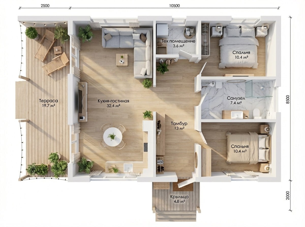 Стильный и уютный одноэтажный дом. Включает две изолированные спальни (по 10.4 м²), просторную кухню-гостиную (32.4 м²) с панорамными окнами и выходом на террасу (19.7 м²), совмещенный санузел (7.4 м²), техническое помещение (3.6 м²) и просторный тамбур. На входе предусмотрено крыльцо (4.8 м²). Габариты дома: 13 х 9 м. Двускатная крыша.