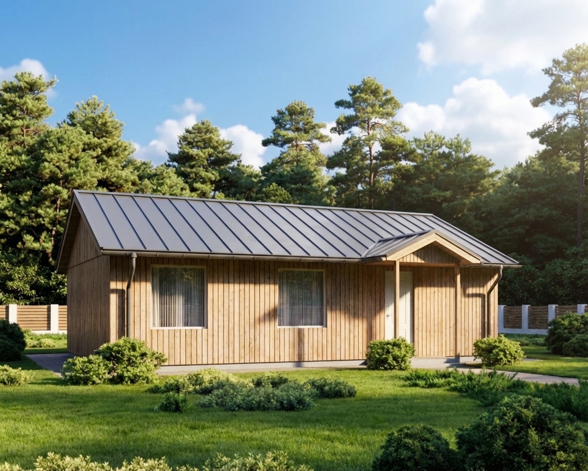 Удобный и функциональный загородный дом для большой семьи с натуральной деревянной отделкой фасада. Продуманная планировка включает три изолированные спальни (12 м², 11.5 м² и 11.5 м²), светлую кухню-гостиную (31 м²), раздельную ванную комнату (4.5 м²) и туалет (1.3 м²), выделенную котельную (4.5 м²) и тамбур при входе. Габариты дома: 12 х 8 м. Двускатная крыша.